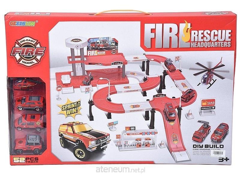 parking straży pożarnej, 52 części, 4 pojazdy metalowe; 52x35x7cm, W/B