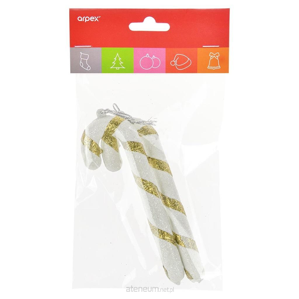 Brokatowa dekoracja świąteczna w kształcie laski cukrowej w kolorze białym ze złotym pasem. Wykonana z tworzywa sztucznego, wyposażona w sznurek umożliwiający jej zawieszenie. W opakowaniu znajdują się 2 sztuki. Produkt o wymiarze 12 c