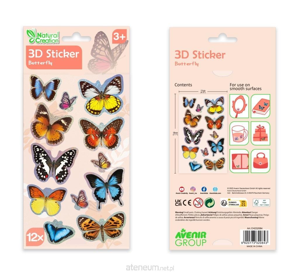 Genialne naklejki 3D!Dzieciom spodoba się przyklejanie ich na wielu różnych powierzchniach (kubkach, lustrach, książkach lub oknach). W zestawie 12 sztuk przepięknych naklejek motyli.