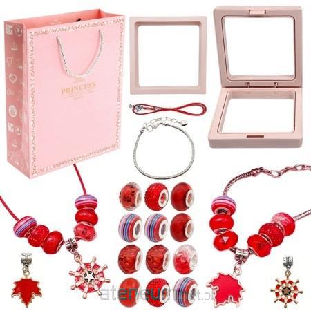 Zestaw obejmuje 10 czerwonych koralików, 2 urocze charmsy, bransoletkę oraz rzemyk, dając dziecku mnóstwo możliwości twórczej zabawy.