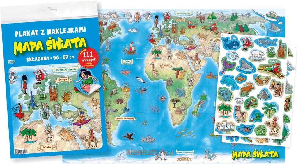 Świat jest piękny i bardzo różnorodny. Na każdym kontynencie i we wszystkich morzach i oceanach można znaleźć coś niesamowitego. Krzyczący strażnik królewski, pociąg jadący do celu niemal tydzień, plujące lamy czy widoczna z kosmosu rafa koralowa - czy nie jest to fascynujące? Dzieci są ciekawe tego, co dzieje się wokół nich, a podróże są świetną okazją, by pokazywać im świat i uczyć otwartości, tolerancji i wrażliwości. Drogi Rodzicu, nie zawsze masz możliwość w danym momencie spakować walizkę i wyruszyć wraz z dzieckiem w podróż, ale możesz poświęcić swój czas, by zacząć pokazywać mu odległe zakątki świata, chociażby w albumach, na zdjęciach i w filmach. Przygotowana przez nas mapa będzie doskonałym wsparciem i przewodnikiem. Zamieściliśmy na niej najbardziej charakterystyczne dla danego miejsca zwierzęta, budowle czy postacie. Niech staną się dla Ciebie inspiracją. Drogie Dzieci, specjalnie dla Was przygotowaliśmy zestaw naklejek, które umieszczone we właściwym miejscu pomogą zapamiętać to, co niezwykłego występuje na konkretnym kontynencie lub w wodach go otaczających. Bawcie się w rodzinne podróżowanie palcem po mapie, zachęcajcie siebie nawzajem do poznawania tego, co nieznane i do wspólnego spędzania czasu. A może będzie to początek wielkiej podróżniczej przygody w rzeczywistości? Publikacja składa się z trzech części: kolorowej mapy o wymiarach 96 x 67 centymetrów, 111 naklejek oraz tyluż opisów do przedstawionych na nich rysunków. Krótkie teksty zawierają wyjaśnienia pojęć, ciekawostki oraz lokalizacje.