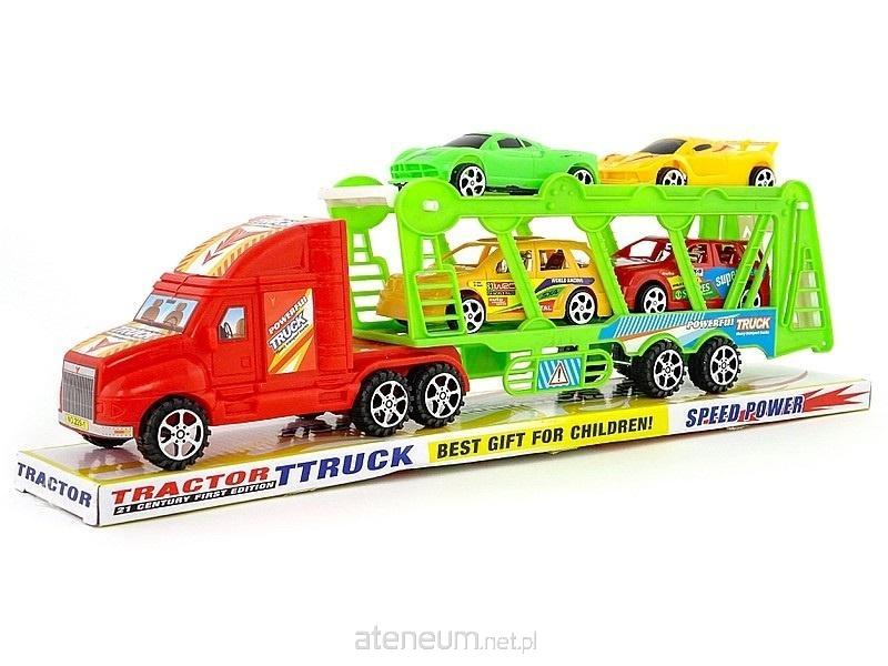 auto ciężarowe z lawetą i 4 autami, z napędem na koło zam; 43x17x8cm, PVC