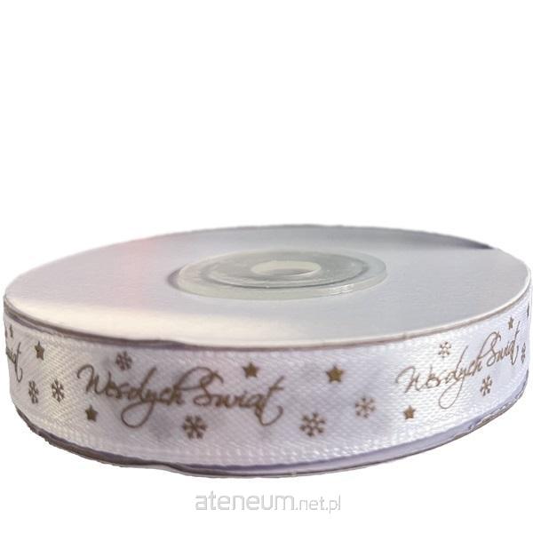 Wstążka satynowa z nadrukiem Wesołych Świąt 12mm 25 yardów biała złoty nadruk
