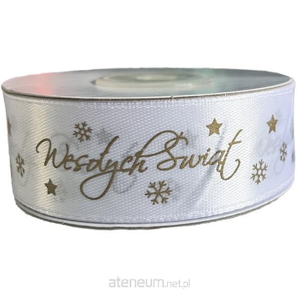 Wstążka satynowa z nadrukiem Wesołych Świąt 25mm 25 yardów biała złoty nadruk