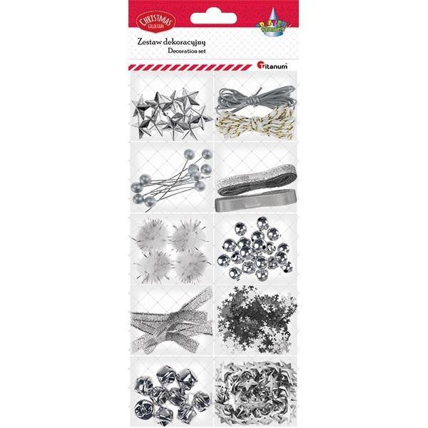 Zestaw dekoracji 12 rodzajów srebrny: koraliki, dzwoneczki, gwiazdki 3D, pompony poliestrowe, kuleczki na druciku, kokardki brokatowe ze wstążki z lureksem, wstążka brokatowa z lureksem, sznurek jutowy, sznurek pleciony, sznurek bałweniany skręcany, konfetti płatki śniegu, cekiny gwiazdki
