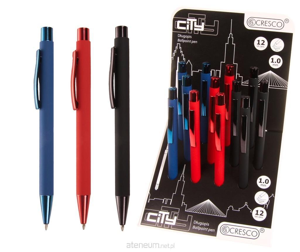 Długopis automatyczny CITY o wyjątkowym softowym korpusie w klasycznych trzech matowych kolorach: czerwonym, niebieskim i czarnym. Wykończenia w tym samym kolorze, ale z połyskiem. Długopis wyposażony został w wymienny wielkopojemnościowy wkład typu zenith o grubości 1mm linii pisania. Dostępne 3 wersje kolorystyczne, w opakowaniu zbiorczym 12szt mix.
