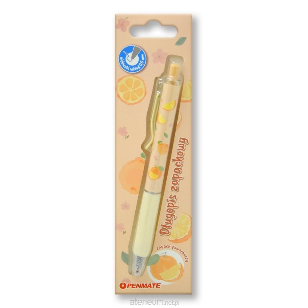 0,5 mm, która nadaje pisaniu niezwykłą miękkość. Tusz zasycha błyskawicznie, co jest ważne dla leworęcznych. Linia pisania wręcz idealna, bez pogrubień i innych znieksztaŁceń. Gumowa nasadka w części chwytowej pachnąca owocami. Zapach pomarańczy . Wymienny wkład w kolorze niebieskim, pasujący od długopisów Solve i Tanco oraz ścieralnych Flexi Klik.
