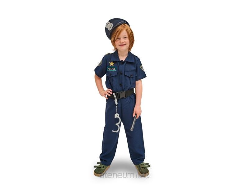 Strój Policjant, dziecięcy, rozmiar 96-116 cm (3-6 lat). Strój w kolorze granatowym ze złotymi naszywkami. Zestaw zawiera czapkę, koszulę zapinaną na guziki, spodnie, regulowany pas, kajdanki oraz radio. Skład: 100% poliester. Wymiary produktu: czapka: obwód 53 cm, koszula: wysokość 49 cm, szerokość pod pachami 40 cm, obwód kołnierzyka 38 cm, spodnie: długość 65 cm, pas: 5x 60-103 cm, kajdanki: 27,5 x 7,4 cm, radio: 13,4x5 cm