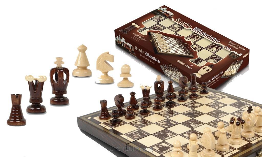 zakupów i zadowolenia z tej " Królewskiej gry ". Szachownica wyposażona jest we flokowaną wkładkę z przegródkami , służącą do przechowywania figur szachowych .Wykonana została z drewna bukowego i brzozowego. Każde z pól szachownicy jest ozdobione portretami Królów Polski . Na planszy znajdują się zarówno daty panowania, jak i charakterystyczne dla nich przydomki .