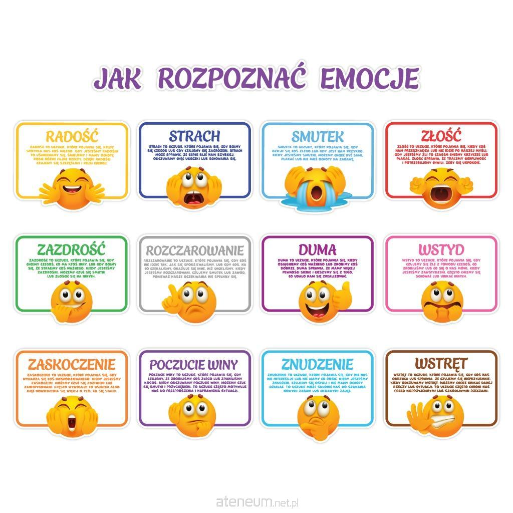 Zestaw składa się z 12 emocji na tabliczkach oraz 3 wyrazowego napisu JAK ROZPOZNAĆ EMOCJE.