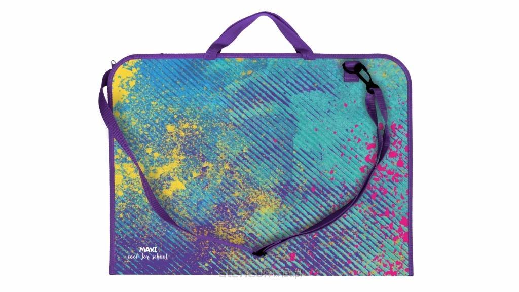 Teczka wykonana ze sztywnego tworzywa PP z ozdobnym nadrukiem oraz obszyciem w kontrastowym kolorze. Wymiary teczki 38x52 cm umożliwiają przechowywanie prac plastycznych w formacie A3 z zapasem miejsca. Wyposażona w zamknięcie na suwak oraz materiałowe rączki i odpinany pasek na ramię. Dodatkowa kieszeń wewnątrz ułatwia utrzymanie porządku. Grzbiet o szerokości 3 cm pozwala na przechowywanie w teczce przyborów plastycznych.