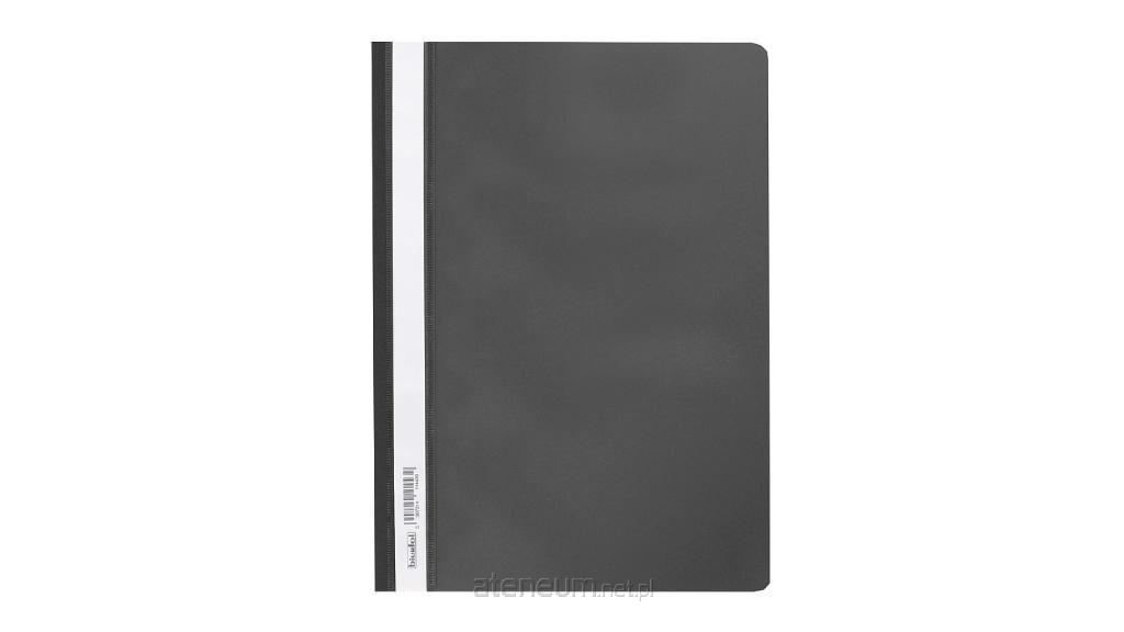 Skoroszyt wykonany z polipropylenu, miękki, przód przezroczysty, tył kolorowy. Wewnątrz klasyczny mechanizm z wąsem i listwą skutecznie zabezpieczający wpiętą zawartość; wąs o długości 14,5 cm. Na bocznej krawędzi wymienny, papierowy pasek do opisu zawartości z kodem kreskowym na szt.. Dwa wycięcia ułatwiające wysuwanie paska. Zaokrąglone rogi obu okładek.