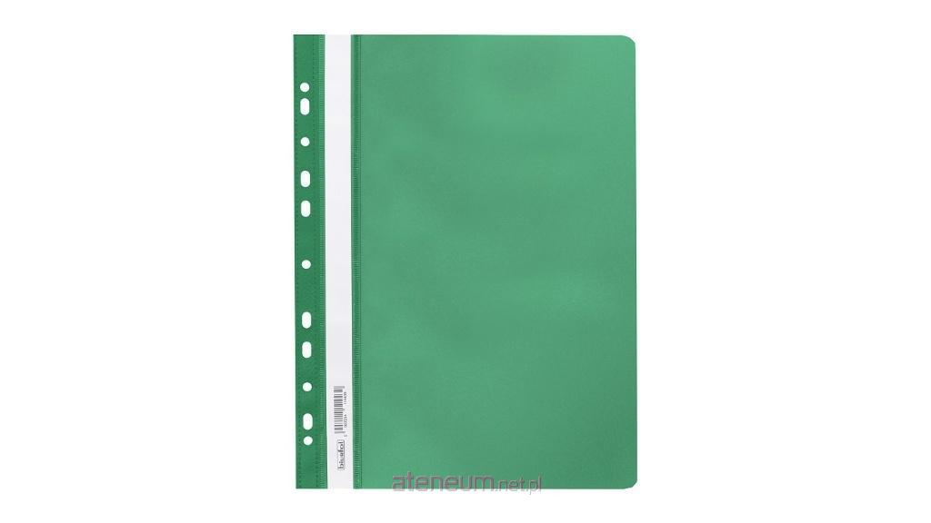 Skoroszyt wykonany z polipropylenu, miękki, przód przezroczysty, tył kolorowy. Europerforacja umożliwiająca wpięcie do segregatora z dowolnym ringiem. Wewnątrz klasyczny mechanizm z wąsem i listwą skutecznie zabezpieczający wpiętą zawartość; wąs o długości 14,5 cm. Na bocznej krawędzi wymienny, papierowy pasek do opisu zawartości z kodem kreskowym na szt. Dwa wycięcia ułatwiające wysuwanie paska. Zaokrąglone rogi obu okładek.