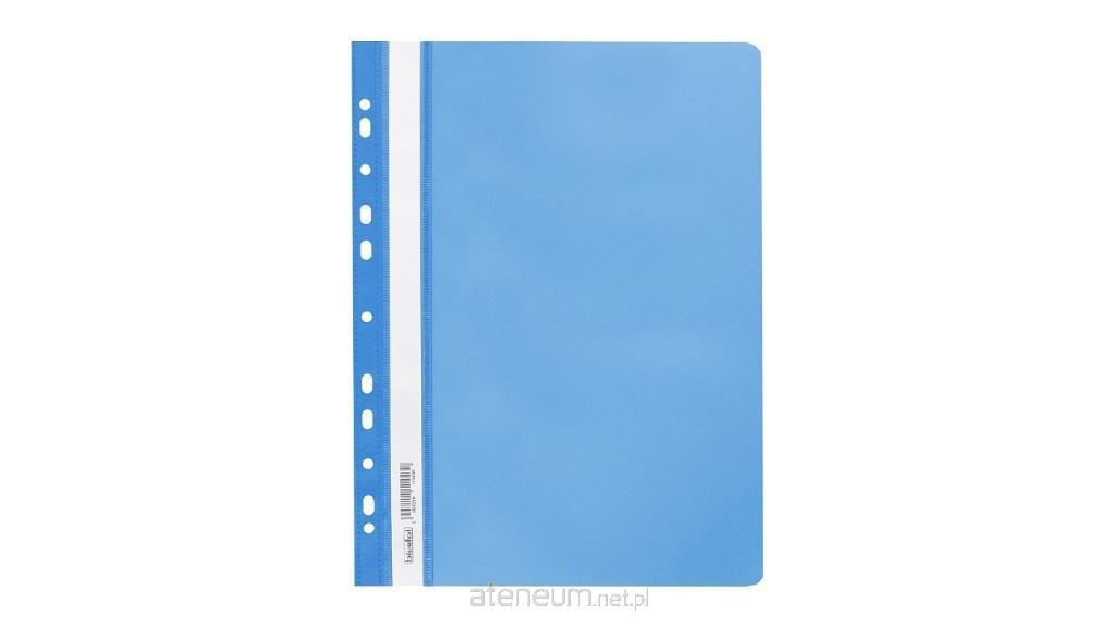 Skoroszyt wykonany z polipropylenu, miękki, przód przezroczysty, tył kolorowy. Europerforacja umożliwiająca wpięcie do segregatora z dowolnym ringiem. Wewnątrz klasyczny mechanizm z wąsem i listwą skutecznie zabezpieczający wpiętą zawartość; wąs o długości 14,5 cm. Na bocznej krawędzi wymienny, papierowy pasek do opisu zawartości z kodem kreskowym na szt. Dwa wycięcia ułatwiające wysuwanie paska. Zaokrąglone rogi obu okładek.