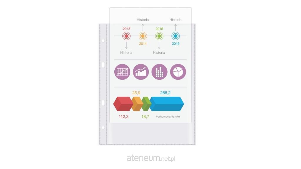 Przód i tył z przezroczystej twardej folii PVC typu 0,15. Zgrzew w kształcie litery "U". Boczna perforacja umożliwiająca wpięcie do segregatora z dowolnym ringiem. Format A5.