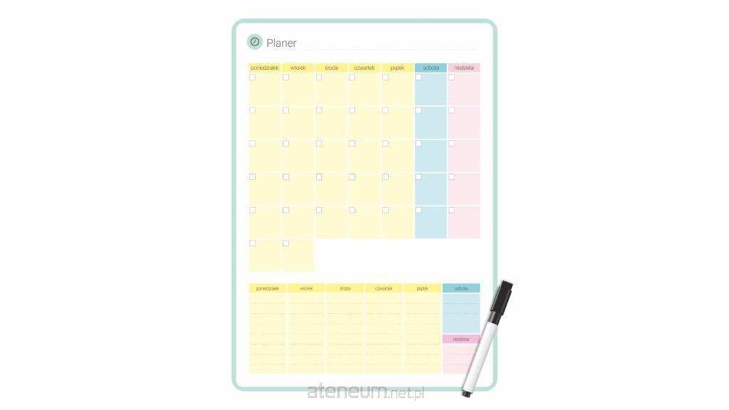 Planer na lodówkę w kolorach kolekcji Pastel. Wyposażony w magnetyczny podkład, dzięki któremu można umieścić go na lodówce, jak i każdej innej powierzchni metalowej. Układ miesięczny znacznie ułatwi zaplanowanie najważniejszych wydarzeń miesiąca, a tygodniowy zanotowanie zadań na bieżący tydzień. Powierzchnia suchościeralna pozwala na wielokrotne użycie planera (zalecamy stosowanie akcesoriów do tablic suchościeralnych). Nadaje się zarówno do domu, szkoły, jak i biura. GRATIS dedykowany, czarny marker z magnesem i gąbką. Wymiary: 35x25 cm.