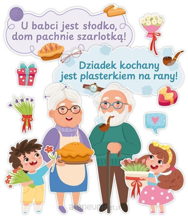Zestaw składa się z 2 dużych postaci babci i dziadka, 2 postaci wnucząt, 2 wierszyków tematycznych oraz 5 elementów ozdobnych.