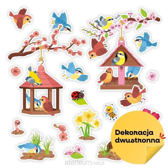 Zestaw składa się z 20 elementów - 2 karmników, 6 fruwających ptaszków, 2 siedzących ptaszków oraz 10 innych elementów (kwiaty, owady, robaczki).