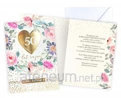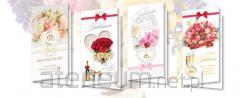 Kartka jest bogato i różnorodnie zdobiona (zależnie od wzoru: metaliczna folia, lakier perłowy,