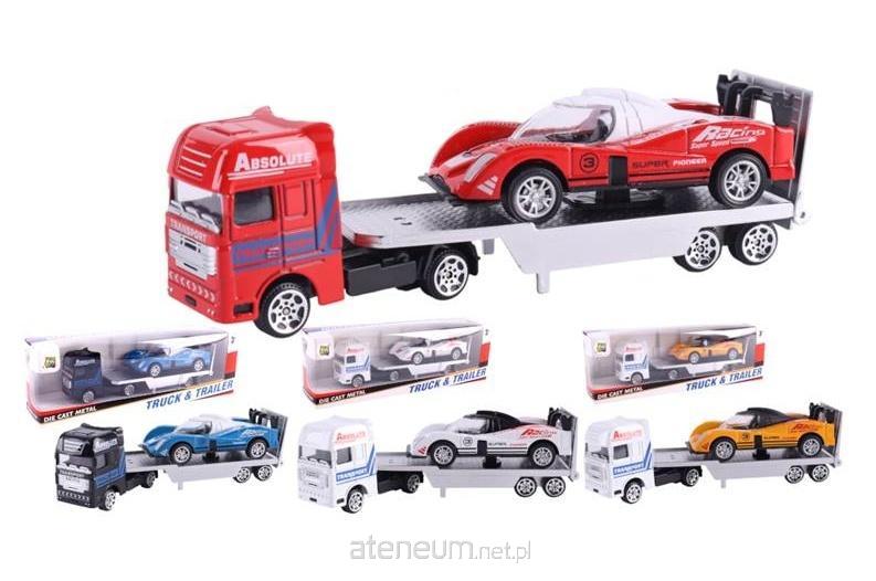 Materiał: Nadwozie ciężarówki i samochodu wyścigowego: metal. Laweta i szczegóły: tworzywo sztuczne