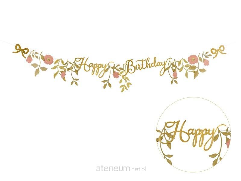 Kwiatowy baner urodzinowy Happy Birthday. Długość ok 1.3 m, wysokość poszczególnych elementów w przedziale 6,4-18,3 cm. Zestaw zawiera złoty sznurek o długości 2 metrów. Baner wykonany z papieru w kolorach różowych, złotych i złotych lustrzanych.