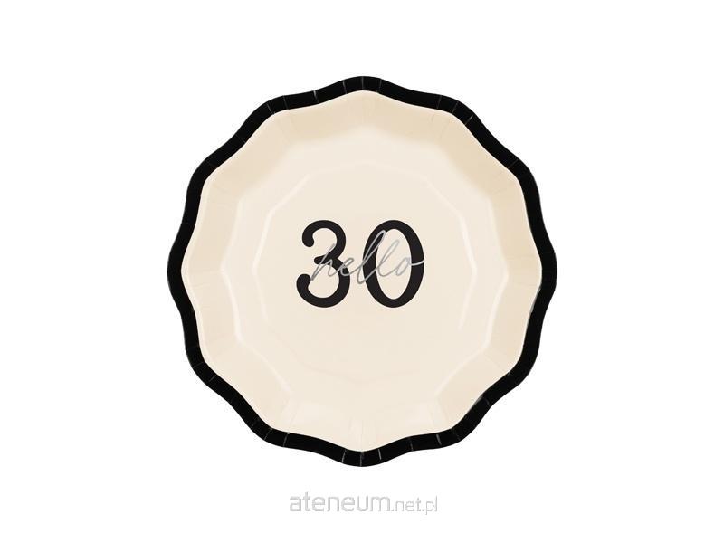 Talerzyki papierowe ''Hello 30''. Kremowe talerzyki na 30 urodziny z czarnymi elementami i srebrnym, błyszczącym napisem Hello. Mix kolorów, średnica około 18 cm.(1 op. / 6 szt.)