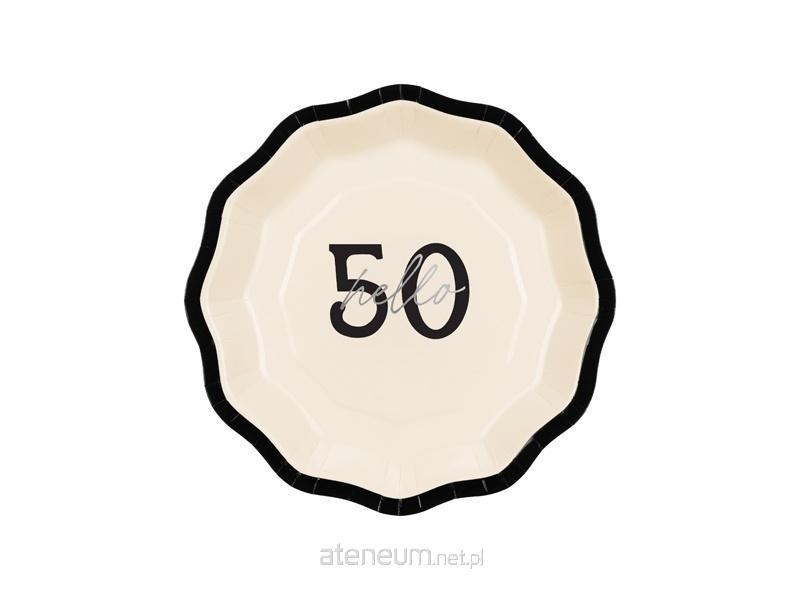 Talerzyki papierowe ''Hello 50''. Kremowe talerzyki na 50 urodziny z czarnymi elementami i srebrnym, błyszczącym napisem Hello. Mix kolorów, średnica około 18 cm.(1 op. / 6 szt.)