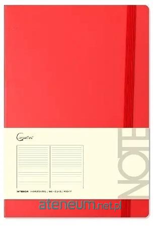Notatnik kołowy. Okładka z tektury w linie. Zapięciena gumkę w kolorze pokrowca. 96 arkuszy o gramaturze 80 g/m2. Różne wzory: linie poziome, kwadraty 4 x 4 mm i gładkie. Rozmiar A5. Wymiary: 210x 148 mm. Czerwony kolor.