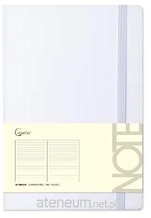 Notatnik kołowy. Okładka z tektury w linie. Zapięciena gumkę w kolorze pokrowca. 96 arkuszy o gramaturze 80 g/m2. Różne wzory: linie poziome, kwadraty 4 x 4 mm i gładkie. Rozmiar A5. Wymiary: 210x 148 mm. Biały kolor.