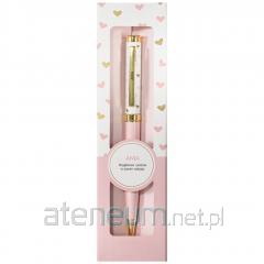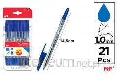 Długopis ma kolorowe korpusy: w 3 przypadkach tusz jest niebieski, a w 1 czerwony (różowy korpus).