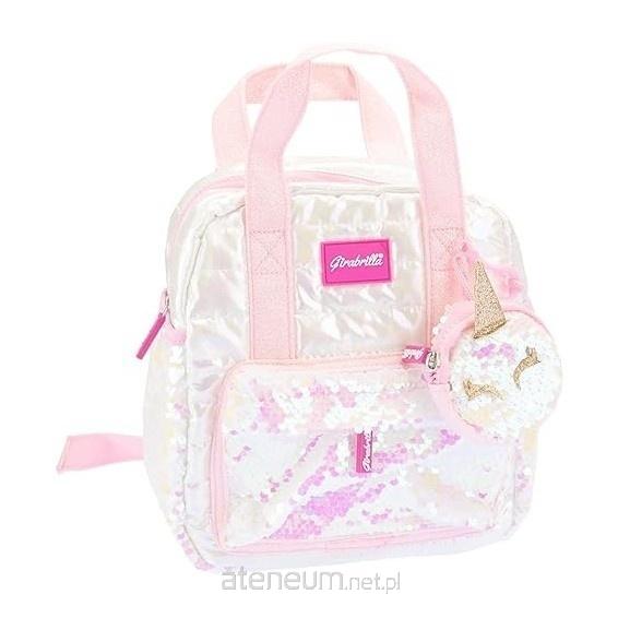 Plecak z portfelikiem na drobiazgi, klucze. Ozdobne szelki, boczne kieszonki oraz przednia cekinowa kieszonka na zamek. Podany w otwartym kartoniku.