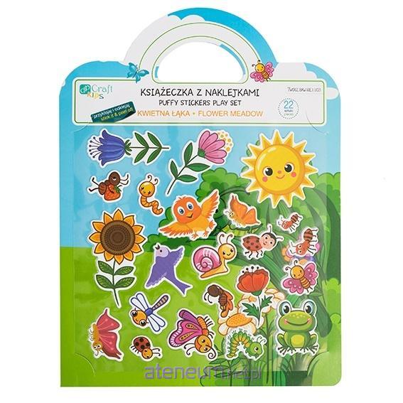 Książeczka z naklejkami to produkt skierowany do dzieci, który pozwala rozwijać kreatywność poprzez budowanie własnych opowieści przy pomocy naklejek. W zestawie znajduje się książeczka z pięknym krajobrazem i gładkim wykończeniem oraz 22 naklejki typu puffy z wizerunkami słońca, kwiatów, owadów i innych uroczych zwierzątek zamieszkujących kwietne łąki, które można wielokrotnie przyklejać i odklejać. Naklejki mają wypukłą teksturę, co sprawia, że są atrakcyjne w dotyku. Produkt rozwija wyobraźnię dziecka, pozwala na tworzenie różnych scenek oraz ćwiczenie zdolności manualnych i koncentracji.