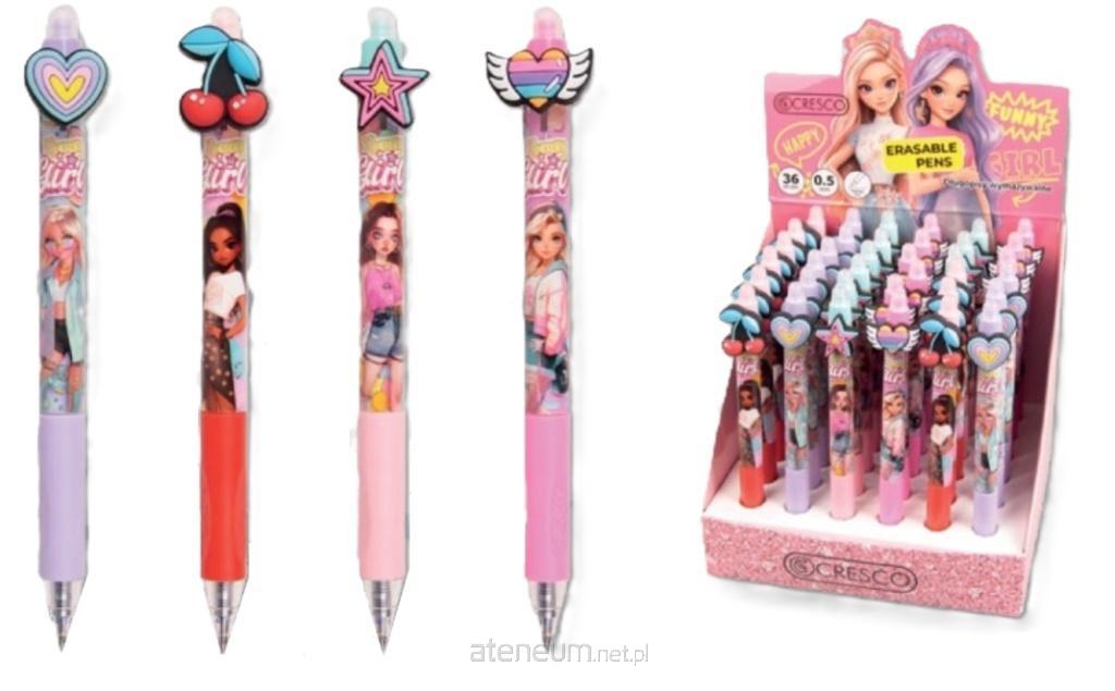 Długopis wymazywalny CRESCO o dziewczęcej tematyce GIRLS. Pstrykany system wysuwania niebieskiego wkładu o linii pisania 0,5mm.