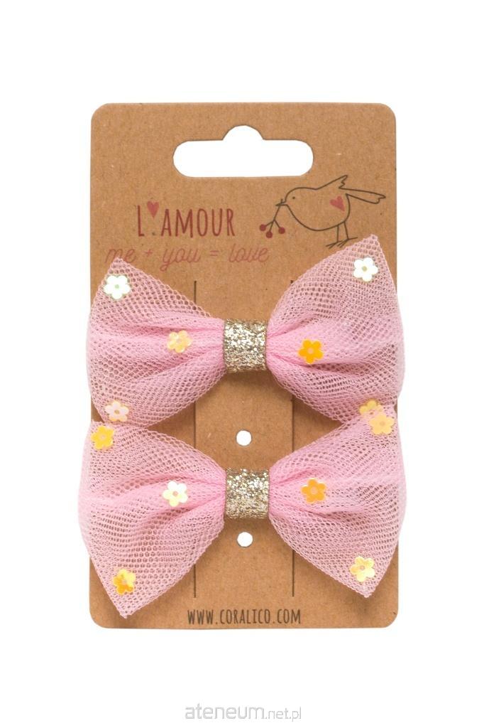 Zestaw klipsów z kokardami i cekinami. Kokardki w kolorze różu ze złotymi cekinami