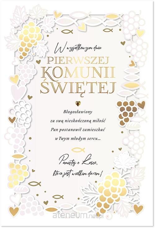 Kartka Primus 0237 na I Komunię Świętą Kartki z serii Primus, to kartki najwyższej jakości, pięknie zdobione złotą lub srebrną folią, tłoczeniami, czy wycinkami laserowymi. W środku każdej kartki znajdują się dobrane do okazji życzenia, a do kartki dołączona jest dopasowana koperta. Cechy szczególne: wymiary: 175 x 250 mm (po złożeniu) zdobienia: dekoracje ze złotej folii, doklejane koraliki, tłoczenia koperta: dopasowana w komplecie, wnętrze kartki: życzenia w środku, okazja: Komunia