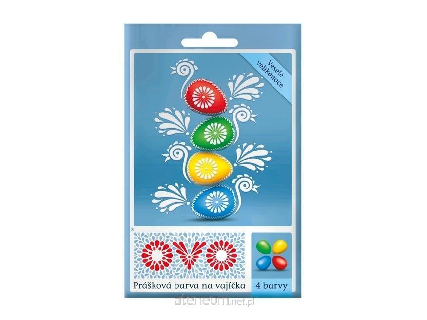 Zestaw 4 szt. farbek w proszku do barwienia jajek. Jedno opakowanie wystarcza do zabarwienia 50-60 jajek. Opakowanie zawiera: 4x farbki w proszku 5g INSTRUKCJA OBSŁUGI: Zawartośc woreczka rozpuścić w 1/3 l gorącej wody (ok. 70 C), z 2-3 łyżkami octu i włożyć czyste, odtłuszczone i ugotowane na twardo jajka na 2-5 minut. Zabarwione jajka wyjąć i pozostawić do wyschnięcia. Dla uzyskania większego nasycenia kolorów użyć mniejszej ilości wody, mieszając poszczególne kolory można uzyskać różne odcienie. Dla uzyskania połysku jajka po barwieniu należy natłuścić. Wymiar: 88mm x 150mm x 5mm (szer. x wys. x gł.)