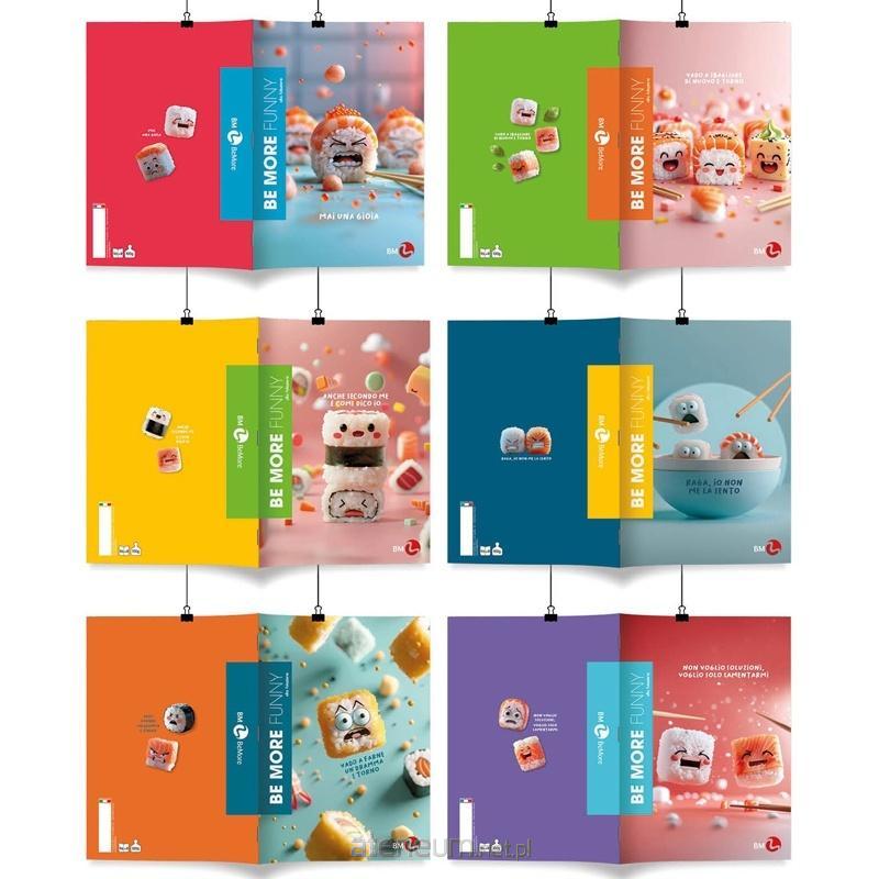 Kolekcja zeszytów Be More Funny posiada okładki z zabawną grafiką w postaci sushi, które mówi. Grafika pokryta jest wybiórczo lakierem UV, co uwydatnia detale i nadaje głębi obrazkom. Zeszyty posiadają kartki o wysokiej gramaturze z marginesami.i.