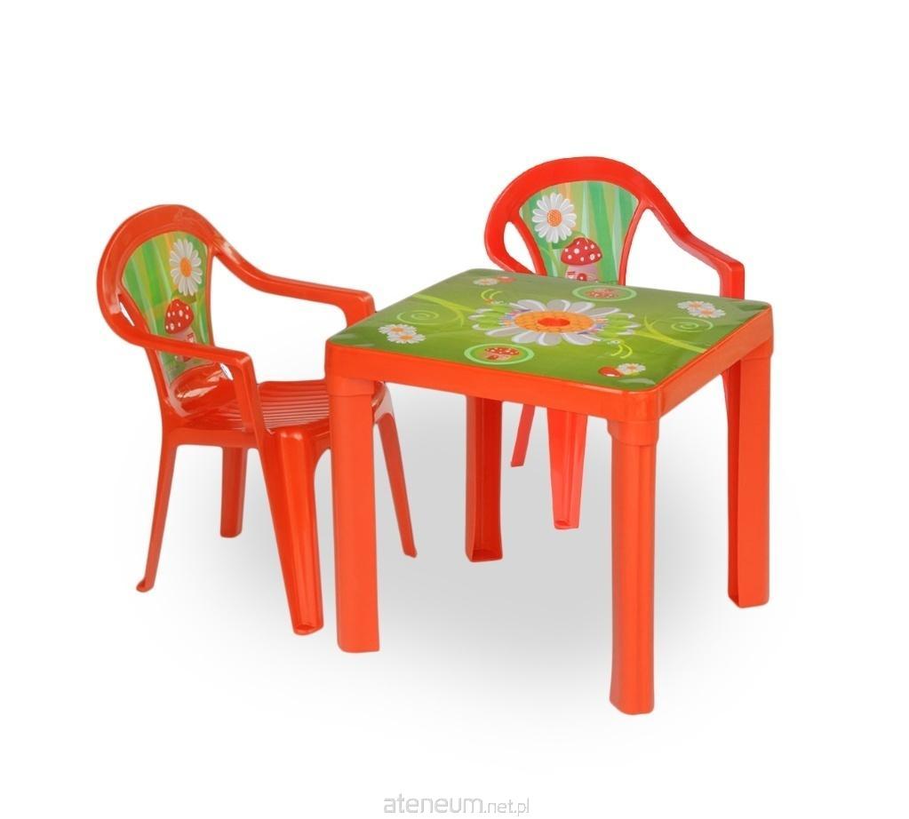 Zestaw: stolik i dwa krzesła, kolor Czerwony, wtopiona etykieta IML z kolorowym motywem w blat stolika i oparcie krzesła uniemożliwa jego odklejenie i gwarantuje wysoką odporność na warunki atmosferyczne, do stosowania zarówno na zewnątrz, jak i wewnątrz
