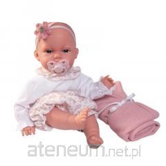 Lalka hiszpańska Petit króliczek ze śpiworkiem 27 cm Antonio Juan 12442 Wyjątkową, przeuroczą lalkę hiszpańską Petit cenionej marki Antonio Juan polecamy dzieciom już od drugiego roku życia. Filigranowy, 27-centymetrowy bobas waży ok. 650 g. Dzięki zastosowaniu miękkiego brzuszka świetnie nadaje się do przytulania. Główka z ręcznie wyrzeźbionymi włosami oraz ruchome kończyny wykonano z wysokiej jakości gładkiego, bezpiecznego dla dzieci winylu. Zwraca uwagę realistyczny wygląd twarzy: niebieskie oczy o głębokim spojrzeniu, malowane brwi i rzęsy, lśniące usta oraz delikatnie zaróżowione policzki. Z kolei na dłoniach i stopach są zarysowane autentycznie wyglądające paznokcie oraz linie papilarne. Atrakcyjności zabawce dodaje miękki śpiworek w kształcie marchewki. Bobas z miękkim brzuszkiem to propozycja pierwszej lali dla najmłodszych Lalka hiszpańska Petit 12442 jest ubrana w bawełnianą, zapinaną na rzep piżamkę w modną biało-różową kratkę. Uroku dodają falbankowe wykończenia. Całość dopełnia słodka czapeczka z króliczymi uszkami i kokardką oraz smoczek zawieszony na satynowej tasiemce. Wszystkie części garderoby można z łatwością zdjąć, a bobasa przebrać. Luksusu dodaje firmowe kartonowe, solidne, pięknie zaprojektowane pudełko z wieczkiem. Może ono posłużyć jako opakowanie prezentowe a następnie łóżeczko dla lali.