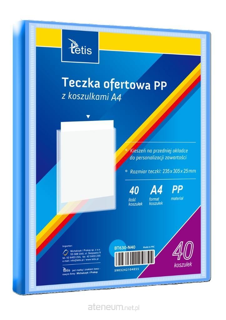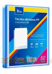 Teczka ofertowa PP z koszulkami. Posiada grzbiet i kieszeń opisową na przedniej okładce, format A4 Teczka posiada 13 przegród. Wymiary teczki: 330x245x35 mm, grubość tworzywa PP: 0,50 mm. Dostępna w pięciu kolorach (niebieski, czerwony, pomarańczowy, żółty, czarny). Opakowanie: folia 1 szt.