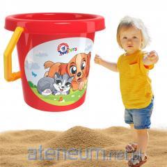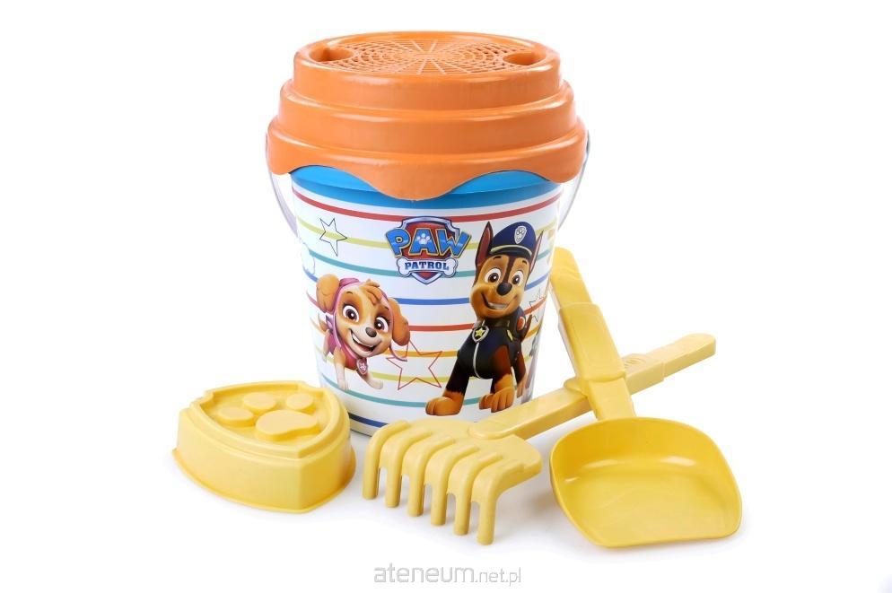 W zestawie: wiaderko śr. 18 cm, sitko, łopatka, grabki, foremka do piasku, Pozostałe informacje: wym. wiaderka: 18 x 31 cm., 3+