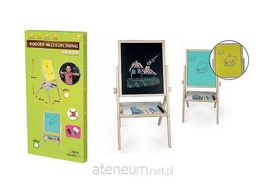 Obrotowa, suchościeralno-kredowa tablica. Kolory tablicy: na kredę czarny, na marker żółty. Wyposażona w gąbkę i 5 kolorów kredy. Do gąbki dołączony polar do wycierania markera. Marker w zestawie.