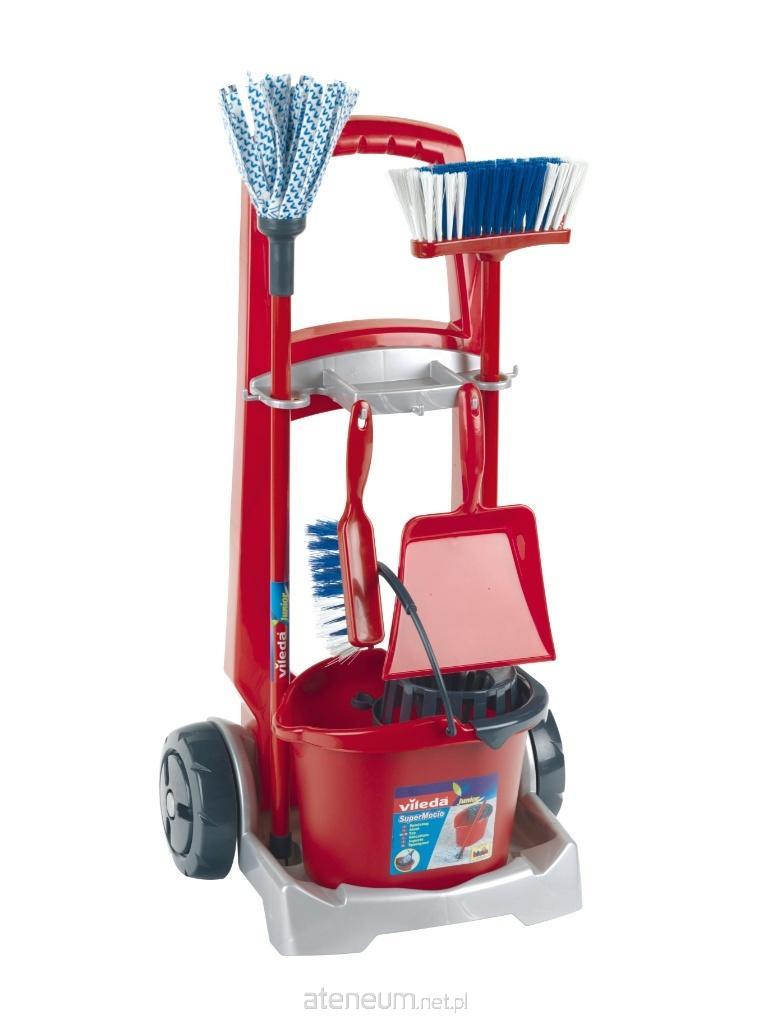 Wózek do sprzątania powstał na licencji firmy Vileda, dlatego też jest wierną kopią prawdziwego zestawu tej marki. Zestaw stanowi duży czerwono-szary wózek z dużymi kołami oraz rączką do prowadzenia. Wózek jest wyposażony w różnego rodzaju akcesoria, dzięki którym dziecko może uczestniczyć w codziennym sprzątaniu lub naśladować rodziców podczas tej czynności. W zestawie znajduje się czerwone wiaderkoo pojemności ok. 2l z czarnym wyciskaczem mopa, czerwona szczotka i zmiotka z szufelką. Zestaw jest łatwy do złożenia, a wszystkie zawarte w nim akcesoria są mini wersją prawdziwych akcesoriów do sprzątania marki Vileda, dzięki czemu dziecko może robić dokładnie to, co jego rodzice. Po złożeniu wózek ma aż około 60 cm wysokości i 35 cm szerokości. Wózek do sprzątania Vileda to doskonały zestaw dla dzieci, które uwielbiają naśladować rodziców podczas sprzątania i z pewnością w krótkim czasie stanie się on także jedną z ulubionych zabawek dziecka.