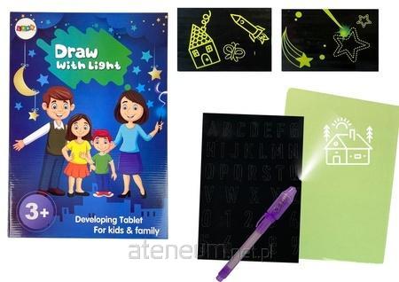 Magiczny Tablet Do Rysowania Światłem Grafika Litery Jak zdusić wieczorną nudę? Proponujemy magiczny tablet do rysowania światłem. Niesamowity efekt i fantastyczna zabawa! Pobudzi ona kreatywność i wyobraźnie malucha. Ogromny tablet najlepiej sprawdzi się w zaciemnionych pomieszczenia, wtedy rysunki będą bardzo dobrze widoczne. Za pomocą długopisu ze specjalnym światełkiem, który jest dołączony do zestawu, można stworzyć najróżniejsze kształty, obrazki lub nauczyć się pisania literek i liczb. W tym pomoże nam szablon z literkami, nic tylko przyłożyć do tabletu i odrysowywać linie. Dlaczego magiczny? Obrazek po narysowaniu znika po kilku chwila i można rozpocząć zabawę od nowa. Wymiary tabletu: 41 cm x 29 cm x 1 cm Wymiary opakowania: 43 cm x 30 cm x 2 cm Zabawka przeznaczona jest dla dzieci powyżej 3. roku życia. Zestaw posiada certyfikat CE i jest zgodny z normą EN 71. Zapakowany jest w kartonik, dzięki czemu nadaje się idealnie na prezent.