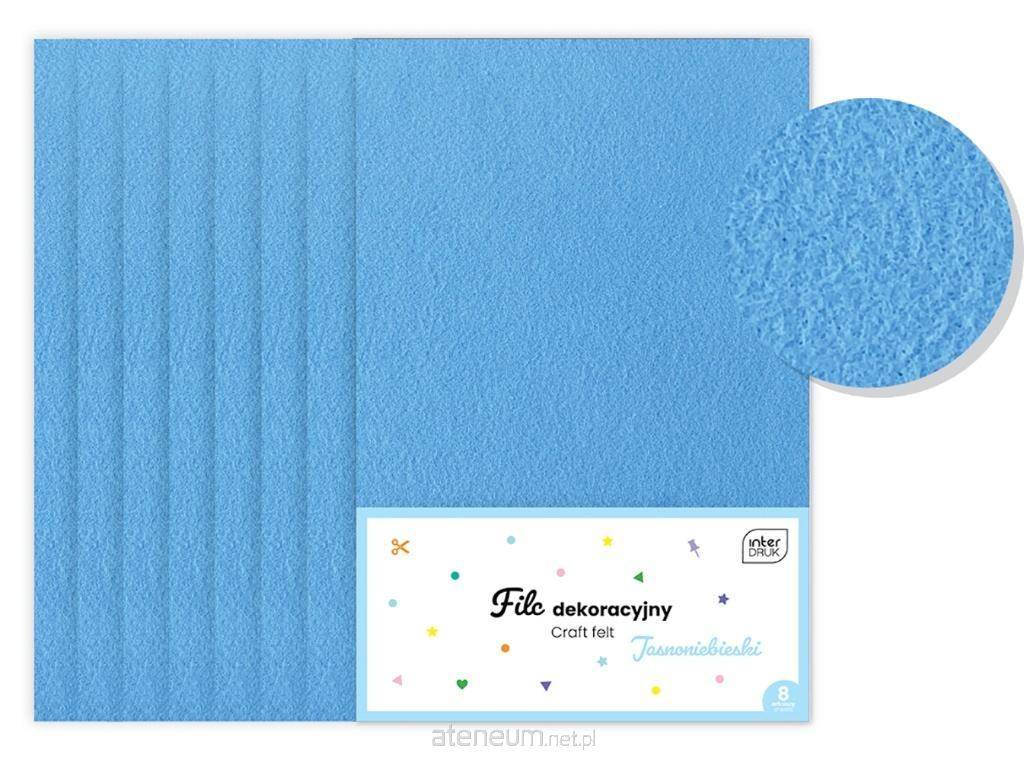 Idealny do szycia ozdób, maskotek, poduszek. Do kreatywnego wykorzystania w scrapbookingu. Opakowanie zawiera 8 arkuszy filców w rozmiarze A4 w jasnoniebieskim kolorze.