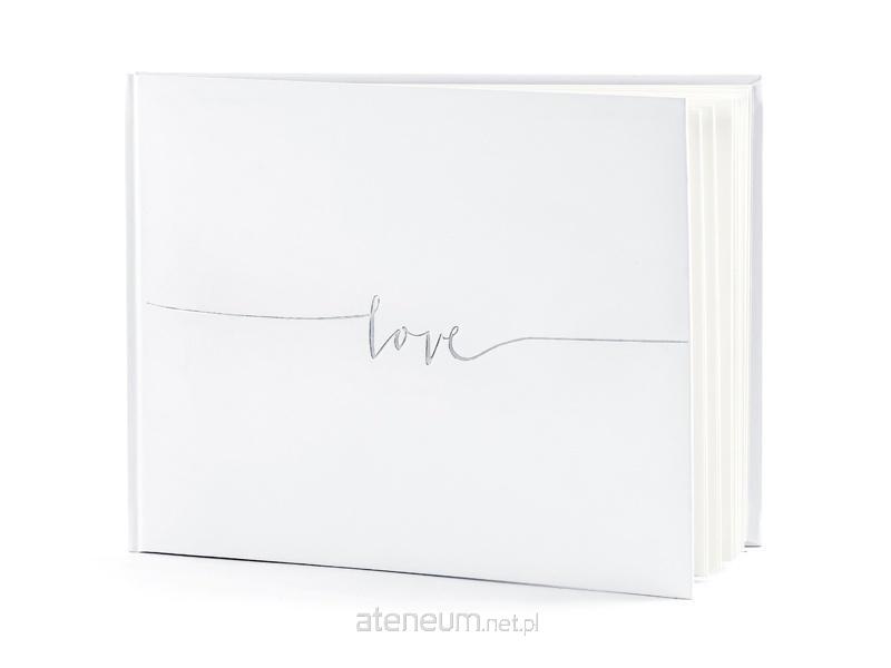 Księga Gości oprawiona papierem w kolorze białym, ze srebrnym napisem Love, wymiary ok. 24 x 18,5 cm, 22 kartki, bez tekstu.
