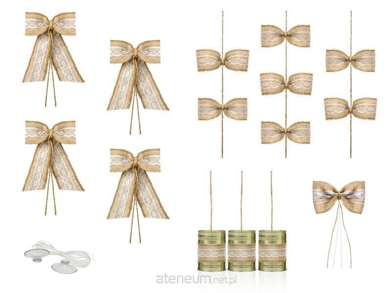 Zestaw dekoracji samochodowych, zestaw zawiera: girlandę wykonaną z juty (długość ok. 6 m), 4 kokardki na klamki wykonane z juty (szerokość ok. 13,5 cm, wysokość ok. 18 cm), kokardę wykonaną z juty ze złotymi puszkami (wymiary kokardy: szerokość ok. 24,5 cm, wysokość ok. 14 cm, puszki - 3 szt.), przyssawki (6 szt.) i żyłkę (ok. 12 m).