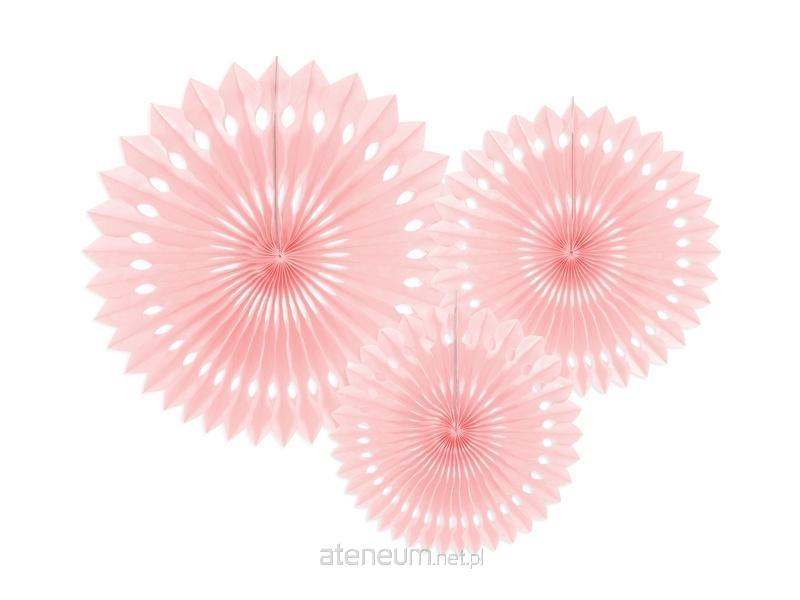 Rozety dekoracyjne wykonane z bibuły w kolorze jasnego pudrowego różu, średnice po złożeniu ok. 20 cm, 25 cm i 30 cm.(1 op. / 3 szt.)