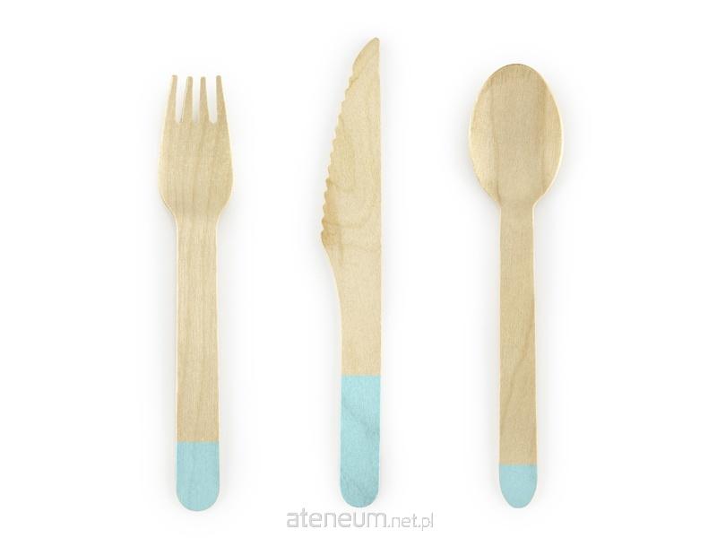 Sztućce drewniane z nadrukiem w kolorze miętowym, wysokość około 16 centymetrów, zestaw zawiera 6 łyżek, 6 noży i 6 widelców.(1 op. / 18 szt.)