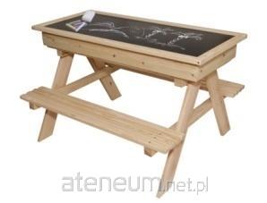 Drewniany zestaw ogrodowy zawierający stolik + 2 ławeczki oraz pojemnik/schowek/piaskownicę. Przykrycie to jednostronna tablica. Zestaw zawiera kredę oraz gąbkę.